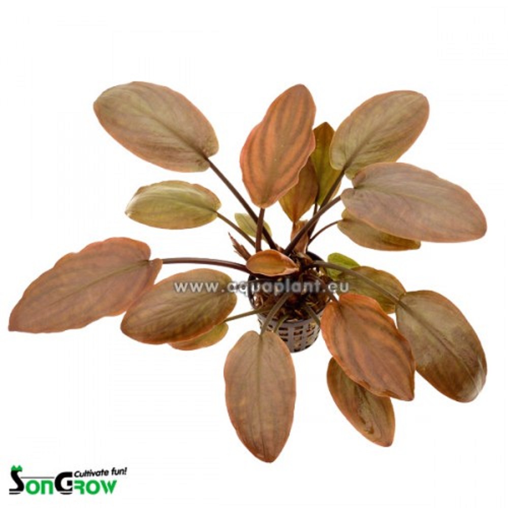 " Eine mittelgroße, langsam wachsende Rhizom-Pflanze in ganz besonderen Braun-Rot Tönen. Diese Farben kommen bei keiner anderen Aquarienpflanze vor. Die Blätter sind oval förmig und können unterschiedlich in der Größe sein. Sie sieht Cryptocorynen sehr ähnlich und braucht, genau wie diese, einen nährstoffreichen Boden und ausreichend Licht, um die schönen Farben entwickeln zu können. Man kann die Pflanze auch auf Wurzelholz befestigen, dann sieht es aus, wie ein kleiner Baum. "